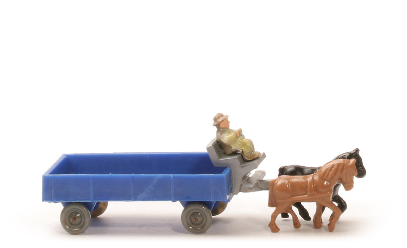 Räder | Drahtachser | Pritschentyp | ohne Querverbretterung | Farbe Pritsche | ultramarin (meliert) | Deichselrest | mit | Pritschenboden | mit Struktur | Zughaken | integriert, nach unten | Deichsel/Kutschbock | silbern | Quersteg Deichsel | mit | Farbe linkes Pferd | schwarz | Farbe rechtes Pferd | ockerbraun | Kutscher Typ | Hut | Kutscher Farbe | ca. grünbeige misch | Kutscher Bemalung | Gesicht, Hände | Räder | ca. basaltgrau glasig |