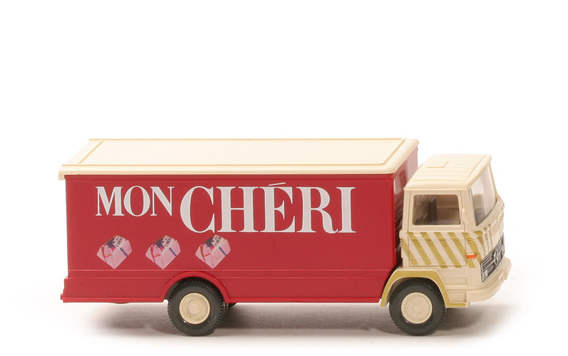 Farbe Kabine | gelbelfenbein | Spiegel | mit | Verglasung | klar | Inneneinrichtung | schwarz, Lkr integriert | Grill | schwarz eingesetzt | Bedruckung Grill | Zierlinien, Stern, Scheinwerfer silbern | Bedruckung Blinker | orange | weitere Bedruckung Kabine | Kotflügel gold, goldene Streifen | Chassis Farbe | schwarz | Chassis Bodenprägung | neues WIKING-Logo | Zughaken | ohne | Reserverad | hinten unter Chassis gesteckt | Bedruckung Rückleuchten | ohne | Aufbau Typ | flacher Koffer | Farbe Koffer | rubinrot | Farbe Türen | gelbelfenbein | Farbe Kofferdach | gelbelfenbein | Koffer Bodenprägung | ohne | Beschriftung | Mon Chéri ... (siehe Foto) | Beschriftung Art | Druck | Räder | 11 mm, anthrazit | Felgen | gelbelfenbein, 6-Loch |