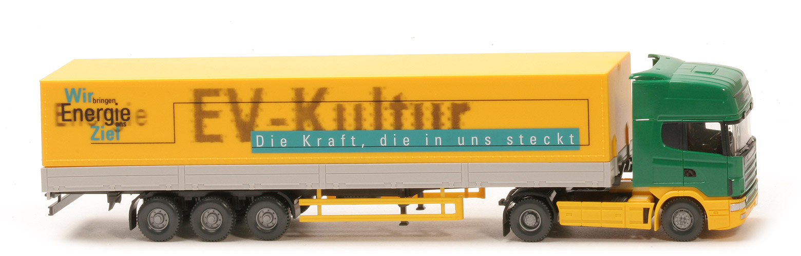 | Zugwagen | Dach | dunkelgrün, Frontdruck "Topline" | Kabine | dunkelgrün | Verglasung | klar | Inneneinrichtung | schwarz, Lenkrad separat | Fensterrahmen, Wischer | schwarz bedruckt | Grill | anthrazitgrau eingesetzt, "Scania" silber | Scheinwerfer | silbern | Druck Typenbezeichnung | 144 - 500 silbern | Stoßstange, Radlauf vorn | blassgelb | Seitenverkleidung | blassgelb | Chassis, Kardanelement | anthrazitgrau | hier Bodenprägung | neues WIKING-Logo, Germany | Sattelpfanne | Teil des Chassis | Kotflügel hinten | schwarz | Reserverad | unter Chassis | | Auflieger | Pritsche | ca. grau | Pritscheneinlage | Pappe silbern | Plane | gelb | Chassis | anthrazitgrau | Kotflügel | anthrazitgrau | Unterfahrschutz Seiten | blassgelb | Stützen | anthrazitgrau | Beschriftung Plane Seiten | "EV-Kultur", ... (s. Bild) | Beschriftung Plane hinten | "Wir bringen Energie als Ziel" | | Räder | Typ | 12mm, Felgen eingesetzt | Felgen | 8-Loch, rot | | Ladung | Link zum Zusatzmodell | Ferrari 348 ts |