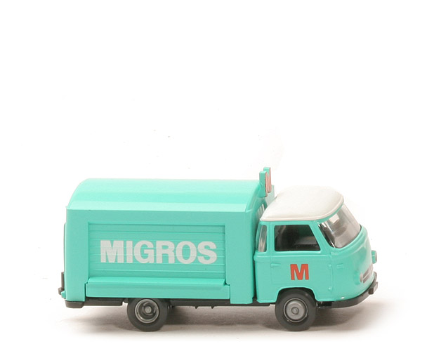 Kabine | minzgrün | Dach | Druck weiß | Verglasung | klar | Inneneinrichtung | ca. anthrazit, Lkr integriert | Bedruckung Front | Scheinwerfer silbern, Grill silbern/schwarz | Bedruckung Türen | "M" ca. orange | Chassis | schwarz | Zughaken | integriert | Bodenprägung | Wiking Germany | Aufbau | minzgrün | Dachschild | minzgrün, vorne "M" ca. orange gedruckt | Rolltüren | minzgrün | Auslagen | silbern | Tresenkante, Innenbereich | minzgrün | Bedruckung Rückleuchten | rot | Beschriftung Seite | "Migros" Druck weiß | Bedruckung Heck | "Migros" Druck weiß, "M" Druck ca. orange | Räder | 8 mm, Felgen eingesetzt silbern B-611 |