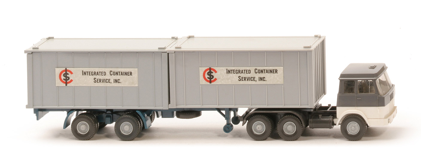 | Zugmaschine | Kabine oben | basaltgrau | Kabine unten | weiß | Verglasung | klar | Inneneinrichtung | 2 Sitze, Motorblock, ca. hellgelbgrau | Lenkrad | ohne | Chassis | basaltgrau | Radlauf hinten | basaltgrau, 1-teilig | Sattelpfanne | für großen Königsbolzen | Reserverad | ohne | Räder | Profil grob | Felgen | silbergrau | | Container | Art | 2 x 20 ft gerippt | Farbe | silbergrau | Beschriftung | ICS (s. Foto) | Beschriftung Art | 5 Felder, Papieraufkleber | | Auflieger | Farbe | ozeanblau | Unterfahrschutz | ohne | Königsbolzen | stark | Räder | Profil grob | Felgen | silbergrau |