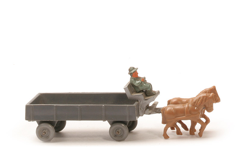 Räder | Drahtachser | Pritschentyp | ohne Querverbretterung | Farbe Pritsche | basaltgrau | Deichselrest | ohne | Pritschenboden | mit Struktur | Zughaken | integriert, nach unten | Deichsel/Kutschbock | silbern | Quersteg Deichsel | mit | Farbe linkes Pferd | ockerbraun | Farbe rechtes Pferd | ockerbraun | Kutscher Typ | Hut | Kutscher Farbe | grünmetallic | Kutscher Bemalung | Gesicht, Hände | Räder | ca. staubgrau |