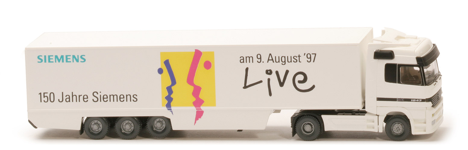 | Zugwagen | Kabine | weiß | Windleitbleche | weiß | Fensterrahmen Wischer Streifen | schwarz bedruckt | Sonnenblende, Grill | schwarz, eingesetzt | Ansaugstutzen | schwarz | Typkennung | MB-Stern, "Actros, 1843" silbern | Inneneinrichtung | ca. basaltgrau, Lkr separat | Kotflügelelement | weiß | Schürze vorne | weiß, hierin Scheinwerfer gesilbert | Chassis, Kardanelement | schwarz | Bodenprägung | neues WIKING-Logo | Seitenverkleidung | weiß | Sattelpfanne | Teil des Chassis | Kotflügel hinten | schwarz | Reserverad | unter Chassis | | Auflieger | Aufbau | weiß | Türen | weiß | Chassis | schwarz | Kotflügel | schwarz | Unterfahrschutz hinten | schwarz | Stützen | schwarz | Beschriftung Koffer | "..., 150 Jahre, ..." ... (s. Foto) | | Räder | Typ | 12mm, Felgen eingesetzt | Felgen | silbern |