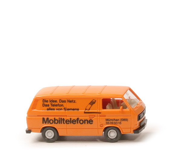 Werbemodell ohne besondere Werbeverpackung. Das Serienmodell mit diesem Druck ist grauweiß. Andersherum gibt es ein Schwestermodell in orangegelb mit dem Druck "Mobilfunk" - siehe Bild unten.