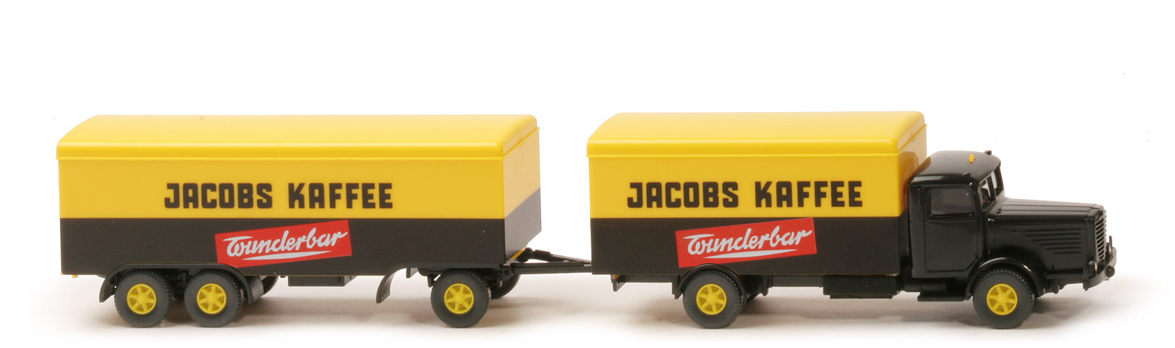 | Zugwagen | Kabine | schwarz | Verglasung | klar | Inneneinrichtung | ca. basaltgrau | Lenkrad | eingesetzt, ca. basaltgrau | Bedruckung Scheinwerfer | silbern | Bedruckung Grill | silbern | Warndreieck | gelb | Chassis Farbe | schwarz | Chassis Typ | fein detailliert, durchbrochen | Bodenprägung | neues WIKING-Logo, Berlin-W, Germany | Zughaken | klein | Reserverad | auf Chassis | Bedruckung Rückleuchten | ohne | Koffer Korpus | gelb | Koffer Türen | gelb | Dach | gelb | | Anhänger | Koffer Korpus | gelb | Koffer Türen | gelb | Dach | gelb | Chassis | schwarz, fein detailliert, durchbrochen | Drehschemel | schwarz | Deichsel | Öse dünn | | Bedruckung | Koffer Seiten | "Jacobs Kaffee ...", ... (siehe Foto) | Türen | "Jacobs Kaffee" | | Räder | Typ | 12 mm, Felgen eingesetzt |
