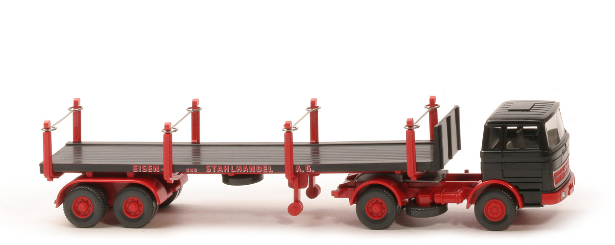 | Zugmaschine | Kabine oben | schwarz | Kabine unten | schwarz | Streifen | ohne | Verglasung | klar | Inneneinrichtung | ca. basaltgrau | Lenkrad | mit | Grill | "feuerrot", Grillumrandung, Zierlinie, Stern silbenr | Stoßstange, Radlauf vorn | "feuerrot", Scheinwerfer gesilbert | Chassistyp | neu, neues WIKING-Logo | Chassisfarbe | "feuerrot" | Radlauf hinten | "feuerrot" | Reserverad | unter Chassis | Rückleuchten | nicht bemalt | Sattelpfanne | mit Steg. für großen KöBo, ähnlich | Räder | 12mm, Profil grob | Felgen | 8-Loch, "feuerrot" | | Auflieger | Farbe Aufbau | schwarz | Farbe Chassis | "feuerrot" | Bodenprägung | neues WIKING-Logo, 51r | Königsbolzen | stark | Doppelachsaggregat Typ | Klemmplatte Wiederauflage | Doppelachsaggregat Farbe | "feuerrot" | Rungen | "feuerrot" | Rückleuchten | nicht bemalt | Ladung | ohne | Drahtschlaufen | mit | Druck | "Eisen- und Stahlhandel A.G." | Räder | 12 mm, Profil grob | Felgen | 8-Loch, "feuerrot" |