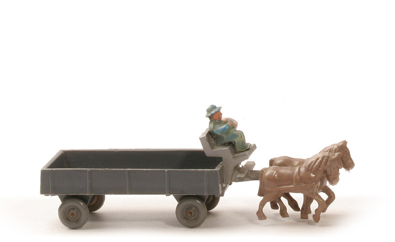 Räder | Drahtachser | Pritschentyp | ohne Querverbretterung | Farbe Pritsche | basaltgrau | Deichselrest | mit | Pritschenboden | mit Struktur | Zughaken | integriert, nach unten | Deichsel/Kutschbock | silbern | Quersteg Deichsel | mit | Farbe linkes Pferd | ca. blassbraun | Farbe rechtes Pferd | ca. blassbraun | Kutscher Typ | Hut | Kutscher Farbe | grün/blau Mischtöne | Kutscher Bemalung | Gesicht, Hände | Räder | glasiges staubgrau |
