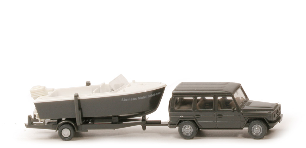 | Zugwagen | Farbe Karosserie | anthrazit | Hecktür | 1-teilig | Reserverad | an der Hecktür, Position: bis Hecktürkante | Grill | Teil des Chassis | Verglasung | klar | Dach | separat aufgesetzt | Inneneinrichtung | ca. graubeige | Chassis Farbe | anthrazit | Bodenprägung | WIKING - Berlin-W | Zughaken | mit, Mikro-Ausführung | Druck Fahrerseite | ohne | Druck Beifahrerseite | ohne | Räder | 9 mm, 2-teilig | Radkappen | silbern | | Boot | Bootoberseite | weiß | Vordersitze | mit Verbindungssteg mit Nippel | Windschutzscheibe | flach (ca. 6 mm hoch) | Lenkrad | anthrazit, 3-speichig | Fußraum (Deck) | anthrazit | hier Prägung | WM | Außenborder | weiß (etwas vergilbt) | Rumpf | anthrazit, Druck "Siemens Mobiltelefone" | | Anhänger | Farbe | anthrazit | Version | Typ 3 (lange Deichsel - kleine Öse) | Nestkennung | "1" | Bodenprägung | Wiking Germany | Befestigung Boot | per Kunststoffhalterung - anthrazit | Räder | Riffelkappe, gesilbert |