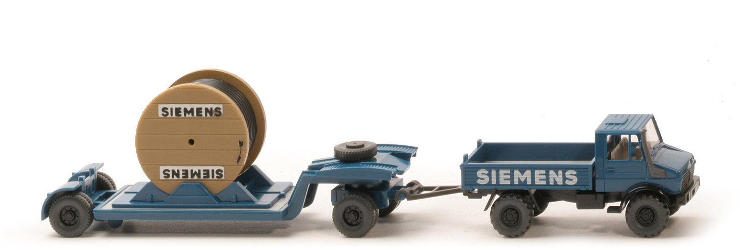 | Zugmaschine | Farbe Kabine | capriblau | Verglasung | klar | Inneneinrichtung | ca. hellolivgrau | Lenkrad | integriert | angesetzter Ansaugstutzen | anthrazit | Kotflügel vorne/Grill | schwarz | Kotflügel hinten | schwarz | Chassis | schwarz | Bodenprägung | WIKING, Berlin-W | Auspuffrohr | mit | Kardanelement Farbe | schwarz | Pritsche | capriblau | Pritscheneinlage | silbergrau | Bedruckung Pritsche | SIEMENS, weiß | Räder | 12 mm, grobstollig, separate Felgen | Felgen | 8-Loch, schwarz | | Anhänger | Grundfarbe | capriblau | gesteckte Rampe | capriblau | gesteckter Radsatz | capriblau | Pritsche | silbergrau | Bodenprägung | WIKING, Germany | Reserverad | über Drehschemel | Trommelhalterung | capriblau | Trommel | ca. braungelb, Druck "Siemens" als Thermodruck | Kabel | schwarz | Räder | 12 mm, 2-teilig, Felgen eingesetzt | Felgen | 8-Loch, schwarz |