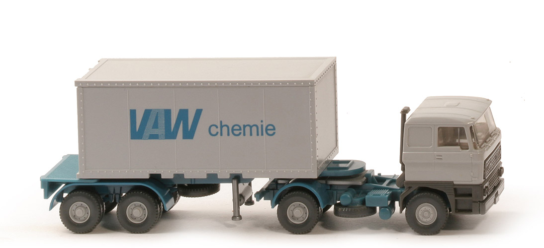 | | Zugmaschine | | Kabine | rot | | hintere Seitenfenster | geschlossen | | eingesetzter Grill | umbragrau | | Inneneinrichtung | ca. graubeige, Lkr integriert | | Kabinenunterteil | umbragrau | | Luftansaugstutzen | umbragrau | | Chassis | diamantblau (!) | | Radlauf hinten | azurblau | | Reserverad | unter Chassis | | Räder | 12 mm, Profil grob | | Felgen | 8-Loch, silbergrau | | | Container | | Art | Glattwand | | Dach, Korpus, Türen | silbergrau | | Beschriftung | "VAW chemie, ..." (s. Foto) | | Beschriftung Art | Druck ca. azurblau | | | Auflieger | | Farbe | diamantblau (!) | | Variante | mit Markierung, BP 526 | | DAA Typ | Klipsachsen, Kotflügel rund | | DAA Farbe | azurblau | | Stütze | silbern | | Räder | 12 mm | | Felgen | 8-Loch, silbergrau |