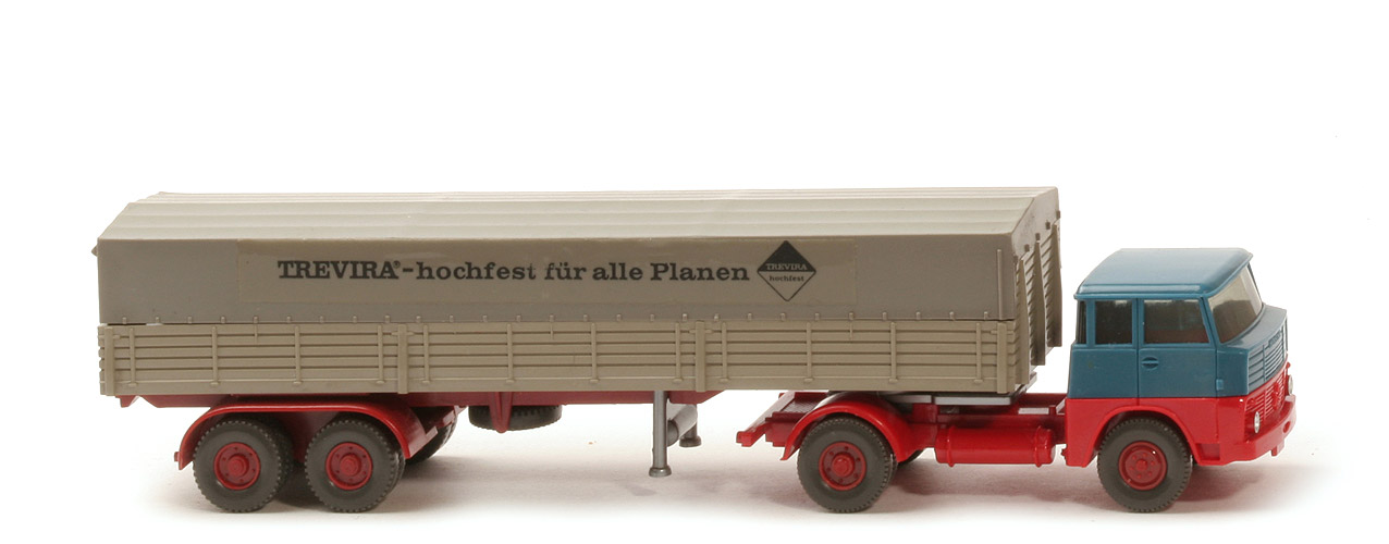 | Zugmaschine | Kabine oben | azurblau | Kabine unten | rot | Verglasung | getönt | Stege für Inneneinrichtung | ja | Chassistyp | neu | Zughaken | ohne | Fläche hinter Sattelpfanne | geriffelt | Chassisfarbe | rot | Sattelpfanne | für großen Königsbolzen | Reserverad | ohne | Räder | 12mm, Profil fein | Felgen | hellbraunrot | | Auflieger | Farbe Pritsche | olivgrau | Pritschentyp | ohne Lasche | Chassis | hellbraunrot | Prägung Chassis | Wiking | Pritscheneinlage | lichtgrau | Achseinheit | hellbraunrot | Typ Achseinheit | Germany/Wiking | Königsbolzen | stark | Stütze | starr | Plane | Seite glatt, vorne Aussp | Plane Farbe | betongrau | Räder | 12mm, Profil grob | Felgen | hellbraunrot | Beschriftung | klare glänzende Folie, Trevira deutsch |