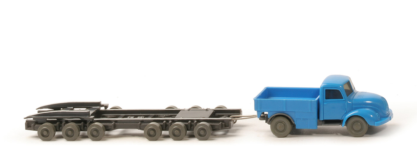 | Zugmaschine | Farbe Kabine | himmelblau | Version Kabine | Typ 4 | Stoßstange | gerade | Kabinenboden | mit Schlitz | Verglasung | getönt | Chassis Farbe | basaltgrau | Chassis Typ | Version 2 | Bemalung | ohne (!) | Achshalterungen | geschlossen | Bodenprägung | WM (ohne Kreis) | Pritsche | himmelblau | Ladung | ohne (!) | Farbe Tonne | silbern | Räder | 10 mm, neuere Ausführung | | Anhänger Culemeyer | Farbe | anthrazit | Bodenprägung | WM im Kreis | Bremsplatte | Fläche glatt | Bemalung | Gleise silbern | Deichsel | Metall | Räder | Walzenräder 7,8mm o. Profil | Farbe Räder | basaltgrau |