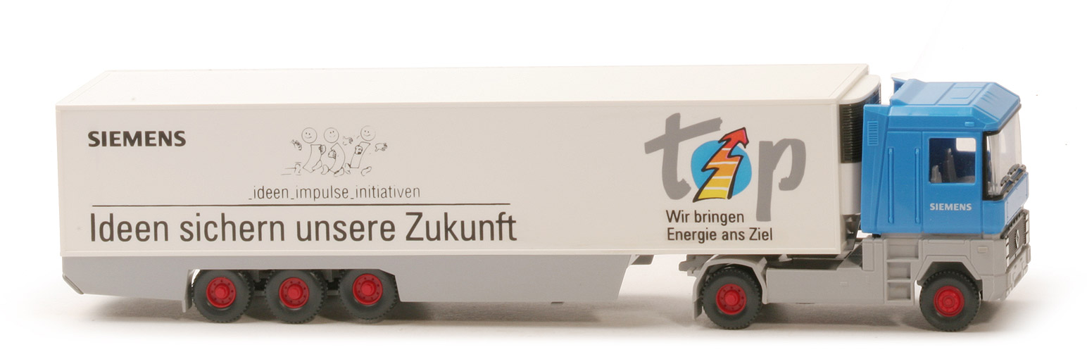 | Zugwagen | Kabine | himmelblau | Verglasung | klar | Inneneinrichtung | ca. silbergrau, Lenkrad separat | Ansaugstutzen | schwarz | Fensterahmen vorn, Wischer | schwarz bedruckt | Beschriftung Türen | "Siemens" (weiß) | Kabine unten, Chassis | silbergrau | Grill | schwarz, eingesetzt | Bedruckung Grill | Scheinwerfer, Renault-Logo silbern | Kardanelement | silbergrau | hier Bodenprägung | neues WIKING-Logo, Germany | Sattelpfanne | Teil des Chassis | Kotflügel hinten | schwarz | Reserverad | unter Chassis | | Auflieger | Aufbau | weiß | Türen | weiß | Kühlaggregat "Carrier" | weiß/schwarz | Chassis | silbergrau | Kotflügel | silbergrau | Unterfahrschutz hinten | ca. basaltgrau | Stützen | silbergrau | Beschriftung Koffer | "Ideen sichern unsere Zukunft ..." + Zusatzdruck (s. Foto) | Typ | 12mm, Felgen eingesetzt | Felgen | 8-Loch, rot |