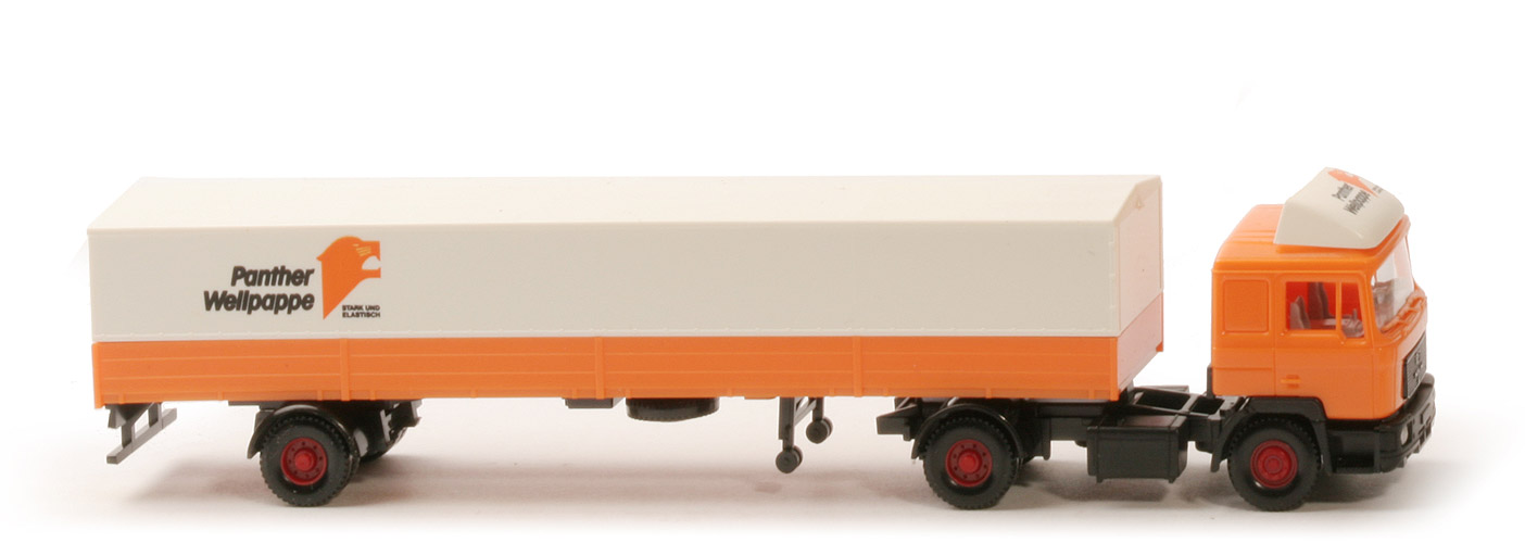 | Zugmaschine | Kabine | rotorange (Spoiler cremeweiß) | eingesetzter Grill | schwarz | Bedruckung Grill | Rand, MAN-Logo, Löwe silbern | Inneneinrichtung | ca. graubeige, Lkr separiert | Kabinenunterbau | schwarz | Stoßstange, Kotflügel | schwarz | Chassis | schwarz | Kardaneinsatz | schwarz, Bodenprägung neues WIKING-Logo, Germany | Radlauf hinten | schwarz | Reserverad | unter Chassis | Räder | Profil grob | Felgen | 8-Loch, weinrot | | Auflieger | Pritsche Art | Langpritsche 4-fach-Teilung | Farbe Pritsche | rotorange | Pritsche Bodenprägung | WIking, Berlin-W, 134-8 | Pritscheneinlage | Pappe, silbern | Plane | ca. cremeweiß | Plane Innenprägung | Wiking, < 134-15 | Einsachsaggregat Farbe | schwarz | Heck | gerade | Warndreiecke | neben Rückleuchten | Unterfahrschutz | mit | Beschriftung Plane Seite | "Panther Wellpappe", ... siehe Foto | Beschiftung Plane hinten | Folie "Südwestkarton" | Räder | schwarz(!), Profil grob | Felgen | 8-Loch, weinrot |