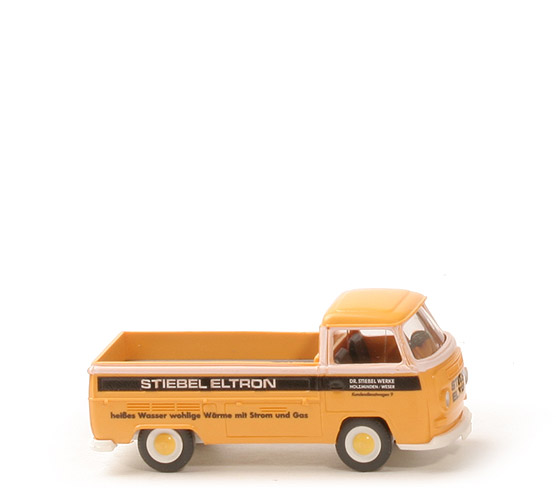 Sehr hübsch bedruckt. Kabinenfront mit "Stiebel Eltron", Seiten mit schwarzem Band mit weißer Schrift "Stiebel Eltron", "Dr. Stiebel Werke, Holzminden, Weser", und in schwarz darunter: "heißes Wasser wohlige Wärme mit Strom und Gas" und "Kundendienstwagen 9". Zirkulär weißes Band und weiße Fensterstreben. Sondermodell für Vedes. |