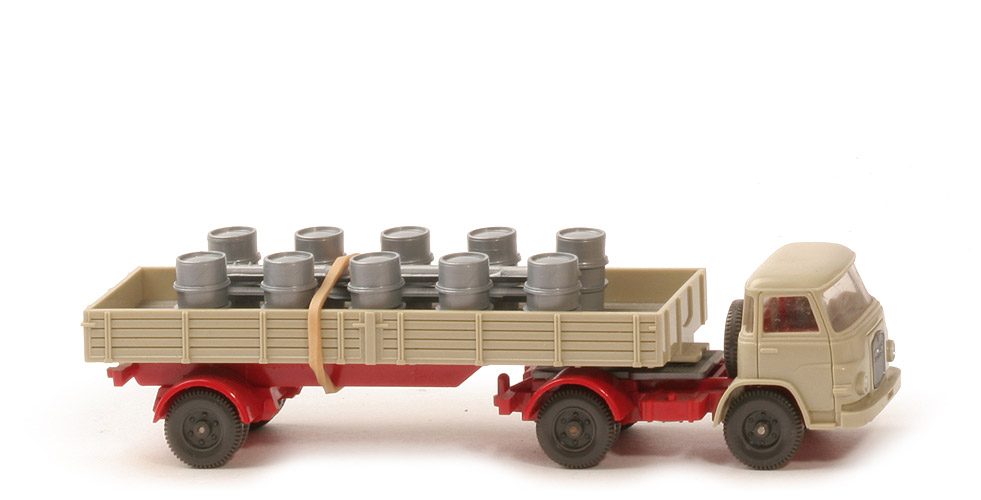 | Zugmaschine | Kabine | hellgelbgrau | Verglasung | getönt | Inneneinrichtung | weinrot | Grill | silbern | Farbe Chassis | rot | Bemalung | Scheinwerfer silbern | Sattelpfanne | neu, für dünnen Bolzen | Bodenprägung | WM Germany | Reserverad | hinter Kabine | Räder | 11mm 6 Loch | | Auflieger | Pritsche Art | Holzpritsche | Pritsche Farbe | hellgelbgrau | Chassis | rot | Bodenprägung | Wiking/Germany | Königsbolzen | dünn | Pritscheneinlage | betongrau | Ladung | 2x 10 Öltonnenhälften an Spritzlingen | Farbe Ladung | blasses silbern | Fixierung der Ladung | Gummiband | Räder | 11mm 6 Loch |