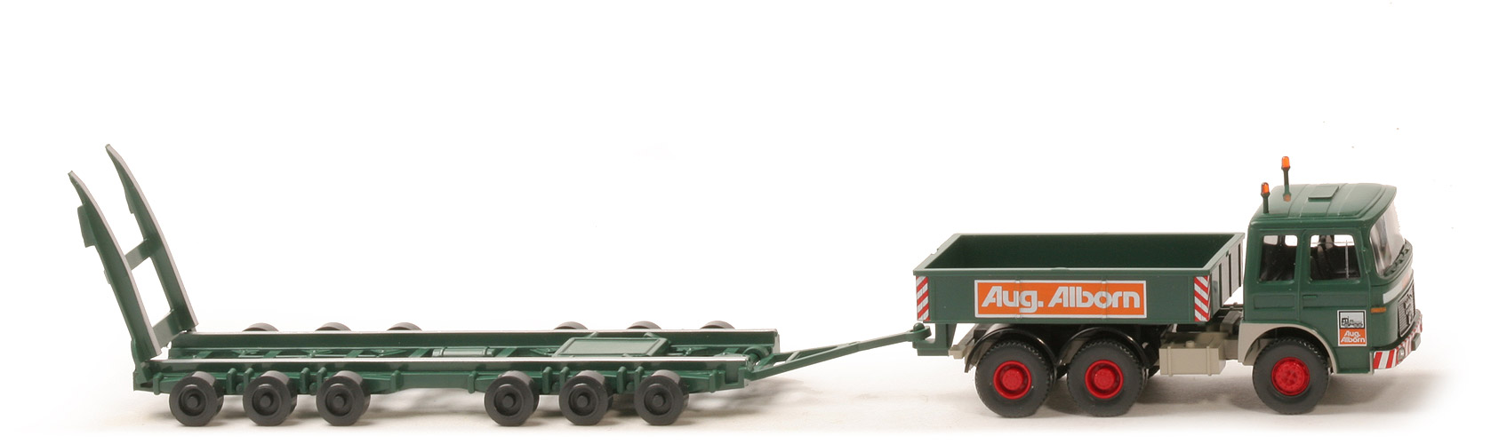 | Zugwagen | Fahrerhaus | ca. diamantgrün | Verglasung | klar | Inneneinrichtung | schwarz, Lenkrad integriert | Spiegel | mit | Scheibenwischer | mit | Lüftergitter | ohne | Grill | schwarz, mit Löwe, Umrandung, "MAN, Diesel", Löwe silbern | Motorblock | schwarz | Chassis | ca. perlweiß, BP neues WIKING-Logo | Warnlichter | orangetransparent, auf grazilen Sockeln ca. diamantgrün | Radlauf | schwarz, 2-teilig | Pritsche | ca. diamantgrün | Pritscheneinlage | ohne | Beschriftung Pritsche | Warnbaken rot/weiß, "Aug. Alborn" | Scheinwerfer | unbemalt | Reserverad | mit | Räder | 12mm, Profil grob | Felgen | silbergrau | | Anhänger | Farbe | ca. diamantgrün | Deichsel | lang, ca. diamantgrün | Räder | ohne Profil | Farbe Räder | anthrazit | Gleise | gesilbert |