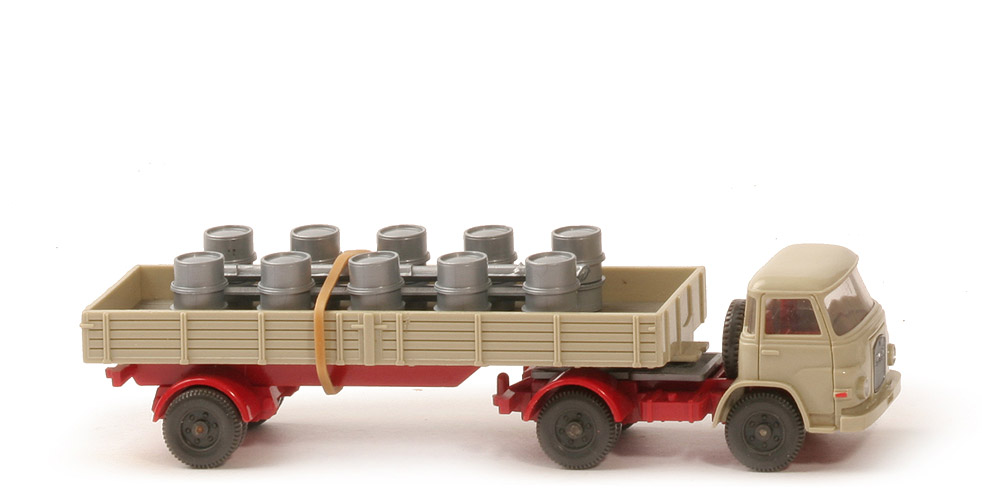Fässer in silber - nicht im GK. Etwas blasser als das typische Silber. Profil fein, nur Reserverad grob. Pritscheneinlage betongrau. Die Blinker der Zugmaschine wurden hier offenbar orange bemalt. Das ist nicht original.