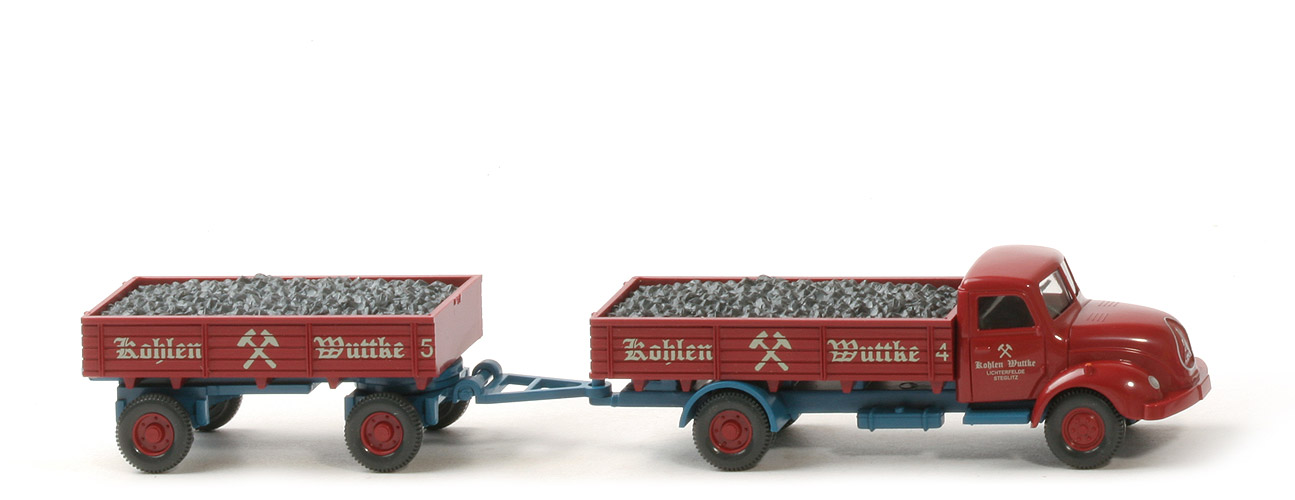 | Zugwagen | Farbe Kabine | weinrot | Version Kabine | Neuauflage ähnlich Typ 4a | Blinker | kurz und dick | Verglasung | klar | Inneneinrichtung | ca. anthrazit, Lkr separat | Bedruckung Scheinwerfer | silbern | Bedruckung Grill | Umrandung, Magirus-Logo silbern | Bedruckung Stoßstange | ohne | Reserverad | ohne | Version Chassis | Neuauflage mit Zughaken | Chassis Farbe | azurblau | Achshalterungen | offen | Bodenprägung | neues WIKING-Logo | Pritsche Art | neue Pritsche mit geraden Seiten | Pritschenseiten | waagerechte Gravuren | Rückleuchten | unter der Pritsche herausragend | Pritsche Farbe | weinrot | Pritscheneinlage | ohne | Ladung | Kohlen, Neuauflage, ca. anthrazit | Bemalung Rückleuchten | ohne | Bemalung Kennzeichen | ohne | | Anhänger | Ausführung | wie Zugwagen | Bodenprägung Chassis | neues WIKING-Logo, Germany | Deichsel | azurblau | | Räder | Typ | 11 mm, 2-teilig | Felgen | 6-Loch, braunrot | | Link | weiteres Wuttke-Modell | Unimog mit Kohlenanhänger |