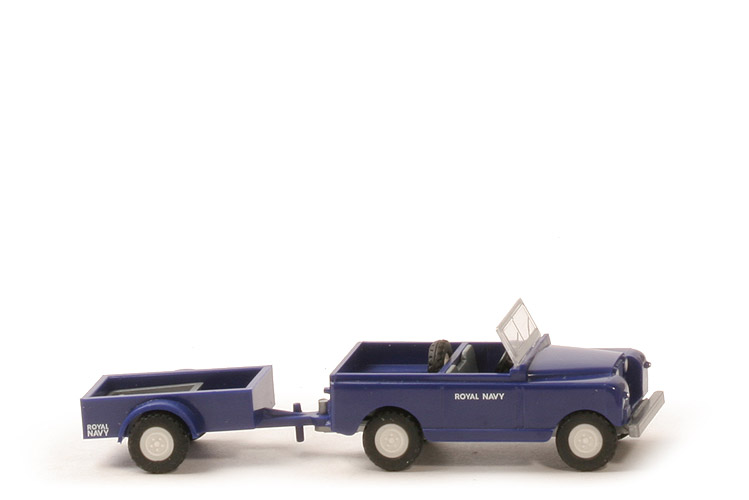 | Landi | Farbe Karosserie | dunkelultramarin | Frontscheibe | klar transparent, eingeklebt | Bedruckung Frontscheibe | Rahmen, Scheibenwischer silbern | Sitze | ca. staubgrau | Fahrer | ohne | Lenkrad | separat eingesetzt, schwarz | Reserverad | hinter Sitzreihe | Chassis | silbern | Bodenprägung | neues WIKING-Logo, 100 | Zughaken | dünn, integriert | Bedruckung Scheinwerfer | silber | Bemalung Blinker vorne | silbern | Bemalung Rückleuchten | rot | sonstiger Druck | "Royal Navy" vorne, Türen und hinten | Räder | 9 mm, Gummi | Radkappen | 5-Loch, weiß | Verdeck | ohne | | Anhänger | Aufbau | dunkelultramarin, ohne Deckel | Deichsel | verstärkt, gerade, Öse groß, mit Abstüzung | Bodenprägung | neues WIKING-Logo, 5, Germany | Achshalterung | längs versetzt offen | Beschriftung | "Royal Navy" Seiten und hinten | weiterer Druck | Blinker orange, Rückleuchten rot | Ladung | Werkzeugkasten (Dachgepäck Postkäfer) |