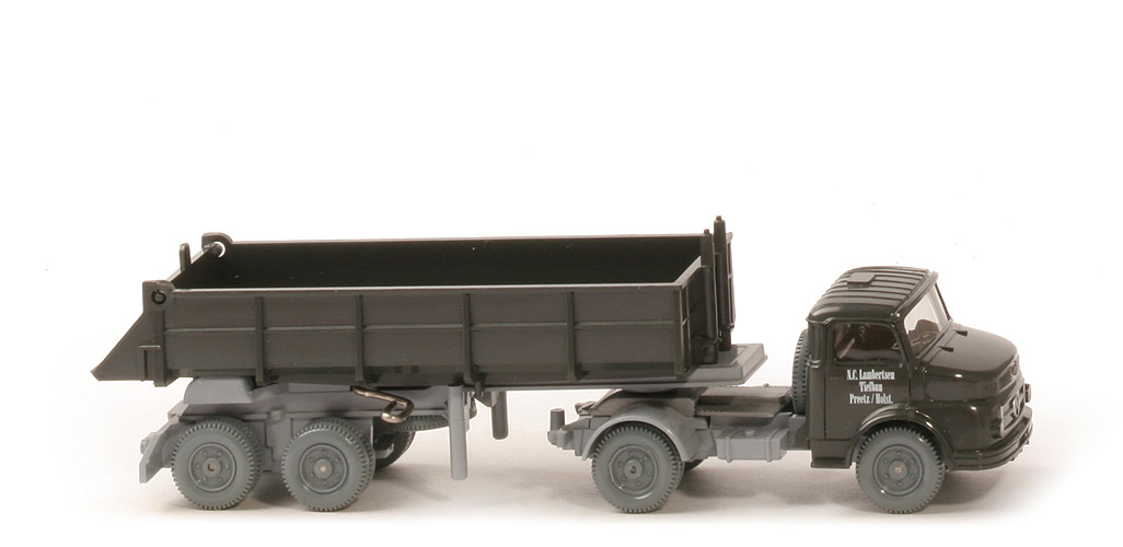 | Zugmaschine | Farbe Kabine | umbragrau | Lüfter | mit | Eckfenster | mit | Grill | integriert, schwarz hinterlegt, Zierlinien, Stern silbern | Verglasung | klar | Inneneinrichtung | schwarz, Lkr integriert | Bedruckung Türen | "N.C. Lambertsen, Tiefbau, Preetz/Holst." | Chassis | silbergrau | Radlauf hinten | silbergrau | Sattelpfanne | für großen Königsbolzen | Reserverad | hinter Kabine, Profil fein | Räder | 11mm, einteilig, Profil fein, ca, staubgrau | | Auflieger | Farbe Mulde und Klappe | umbragrau | Farbe Chassis | silbergrau | Bodenprägung Chassis | Wiking Germany | Farbe Scharnierhalterung | silbergrau | Farbe Achshalterung | silbergrau | Bodenprägung Achshalterung | 67 S | Königsbolzen | stark | Reserverad | unter Chassis, Profil grob | Räder | einteilig, Profil fein, ca, staubgrau |