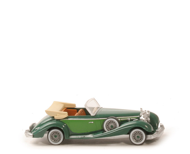Farbe | kieferngrün, seitlich gelbgrün schabloniert | Grill | eingesetzt, silbern lackiert | Reserveräder | auf vorderen Kotflügeln | Frontscheibe | klar transparent | Inneneinrichtung | ca. ockerbraun | Lenkrad | eingesetzt, ca. gelbelfenbein | Verdeck | ca. gelbelfenbein | Chassis | silbern lackiert | Bodenprägung | Mercedes, 540K, neues WIKING-Logo | Räder | 9 mm, Weißwand | Felgen | Roadster Felgen, Naben ca. kieferngrün |