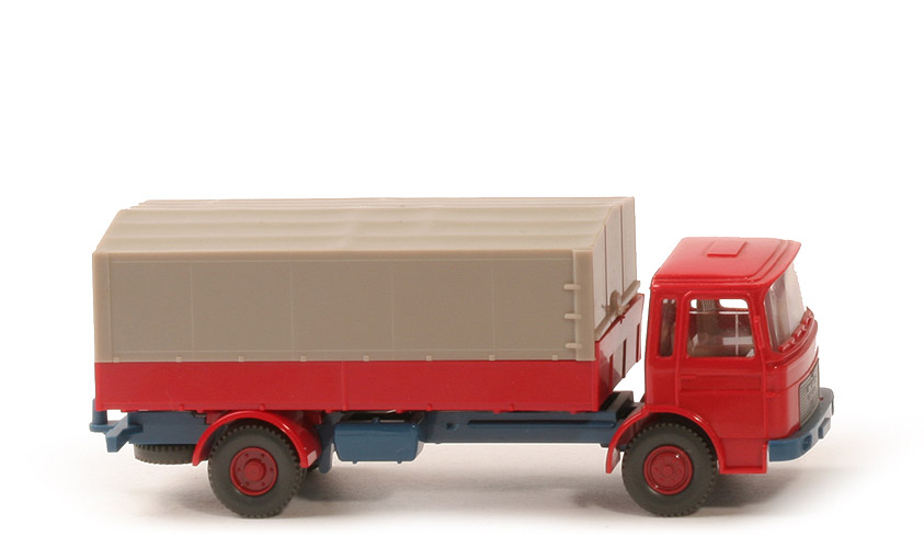 Fahrerhaus | rot, Prägekante Front gering | Verglasung | klar | Inneneinrichtung | ca. graubeige, mit integriertem Lkr | Grill | silbern, eingesetzt | Scheinwerfer | ungesilbert | Chassis | capriblau, Bodenprägung WIKING Berlin-W | Zughaken | lang (ca. 5 mm) | Radlauf hinten | rot | Reserverad | hinten unter Chassis, 12 mm | Pritsche | rot | Pritscheneinlage | weißes Papier, schwarze Linien | Plane | helles graubeige, hinten geschlossen | Räder | 12mm, Profil grob | Felgen | 6-Loch, hellbraunrot |