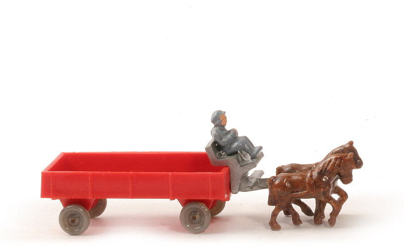 Räder | Drahtachser | Pritschentyp | ohne Querverbretterung | Farbe Pritsche | orangerot | Deichselrest | mit | Pritschenboden | glatt | Zughaken | ohne | Deichsel/Kutschbock | silbern | Quersteg Deichsel | mit | Farbe linkes Pferd | lehmbraun meliert | Farbe rechtes Pferd | lehmbraun meliert | Kutscher Typ | Mütze | Kutscher Farbe | graublau uni | Kutscher Bemalung | Gesicht, Hände | Räder | glasiges basaltgrau |