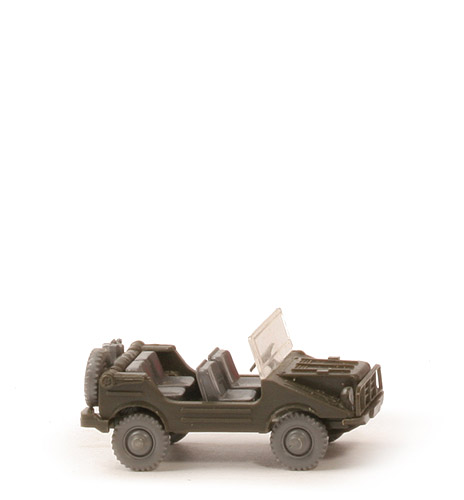 Farbe Karosserie | olivgrün | senkrechte Streben am Heck | ohne | Rückleuchten | ohne | Frontscheibe | klar transparent, eingeklebt | Lenkrad | silbern, 3-speichig | Sitze vorne | basaltgrau | Sitze hinten | basaltgrau | Chassis Farbe | olivgrün | Achshalterungen | geschlossen | Bodenprägung | WM | Reserverad | rechts angeklebt | Benzinkanister | links angeklebt, silbern | Bemalung Scheinwerfer | silbern | Bemalung Kennzeichen | silbern | Räder Typ | 8 mm, Profil grob, Nabe gewölbt | Räder Farbe | basaltgrau |