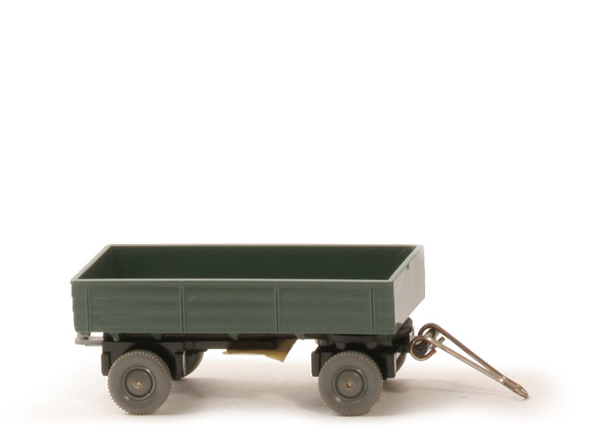 | Pritsche | Pritsche Farbe | graugrün | Pritschenseiten | mit Struktur | Pritscheneinlage | ohne | Kennzeichen hinten | einteilig | | Chassis | Chassis Variante | Typ 2 | Chassis Farbe | schwarz | Achshalterungen | offen | Drehschemel | eingesteckt | Bodenprägung Drehschemel | WM | Bodenprägung Chassis | ohne | Zughaken | silbern, Typ LKW, unter Chassis geklebt | | weitere Details | Deichsel | Metall, lang | Bemalung Rückleuchten | rot | Bemalung Kennzeichen | ohne | Räder | 10 mm, neuere Ausführung |