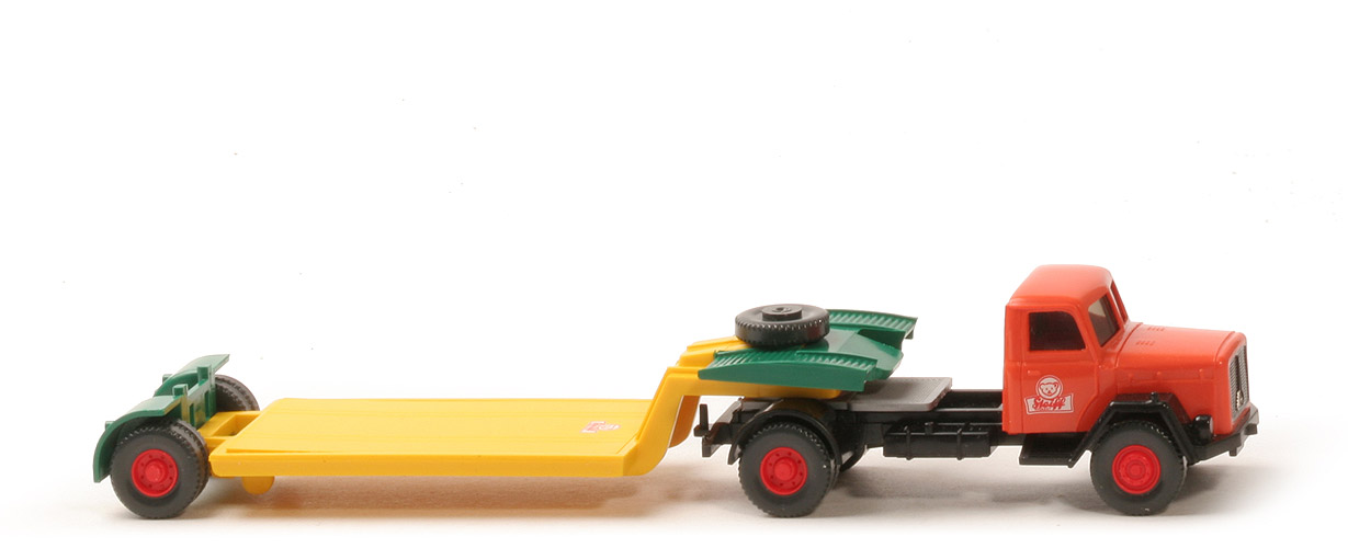 Durch neu entwickeltes Chassis für den Saturn möglich gewordener Sattelzug. Modell mit sehr spielzeughafter bunter Anmutung. |