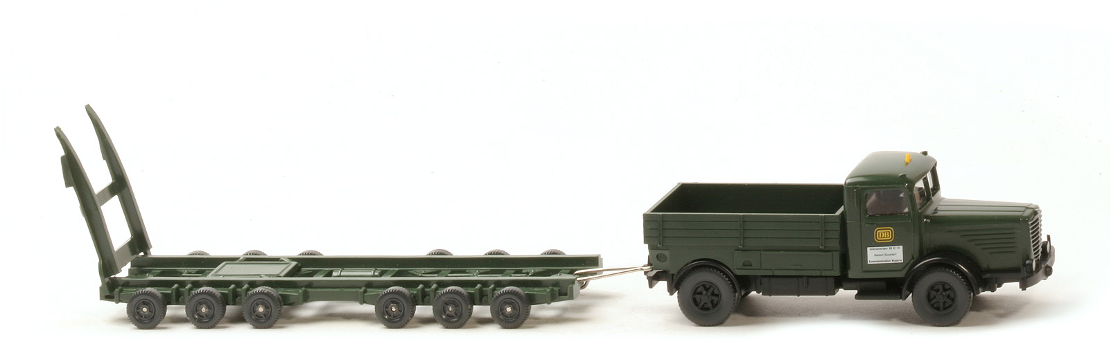 | Zugmaschine | Kabine | tannengrün | Verglasung | klar | Inneneinrichtung | anthrazit | Bedruckung Scheinwerfer | silbern | Bedruckung Grill | silbern, schwarz hinterlegt | Warndreieck | gelb | Koflügel vorne | schwarz | Chassis Farbe | schwarz | Sattelpfanne | für großen Königsbolzen | Bodenprägung | neues Wiking-Logo, Germany | Zughaken | dünn | Reserverad | ohne | Koflügel hinten | schwarz | Pritsche | tannengrün | Pritscheneinlage | ohne | Räder Typ | 12 mm, Felgen eingesetzt | Felgen | Trilex, schwarz | | Anhänger | Farbe | tannengrün | Deichsel | Metall | Bodenprägung | WIKING (altes) Logo, Germany 59 | Räder | Walzenräder, 7,8 mm m. Profil | Farbe Räder | anthrazit | | Eisenbahnwagen | Hersteller | Electrotrain | Farbgestaltung | weiß/schwarz | Bedruckung | "Werco", etc. |