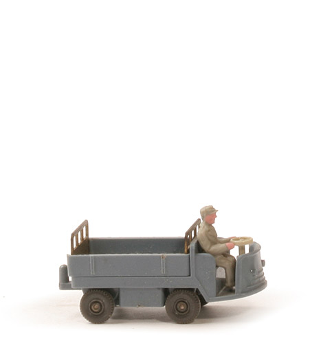 Aufbau | graublau | Fahrer | ca. olivgrau | Lenkrad | hellgelbgrau, 3-speichig | Bodenprägung | WM, Germany, 116 | Zughaken | integriert | Batteriekasten/Achshalterung | graublau | Aufsatz mit Messingwänden | graublau | Bemalung | Scheinwerfer: ohne | Räder | ca. 7 mm, anthrazit |