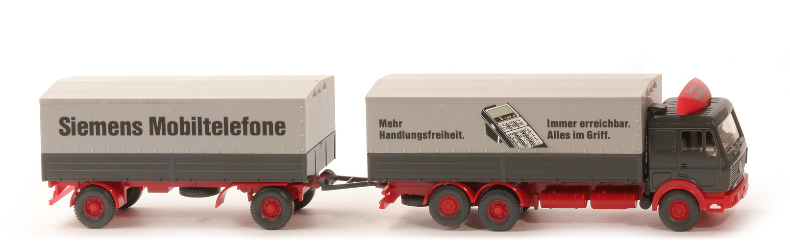Das Modell gab es häufig noch ohne Abziehbild eines Mobiltelefons zwischen den beiden Schriftzügen auf der Plane des Zugwagens (GK Siemens 31). |