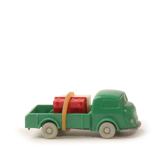 Achsen | Rollachser | Karosserie | grün | Chassis Farbe | silbern | Bodenprägung | WM (im Kreis) | Schlepploch | mit | Bemalung Scheinwerfer | silbern | Bemalung Heck | ohne | Zughaken | immer ohne | Räder Typ | 8 mm, mit Profil | Räder Farbe | ca. lichtgrau | Ladung | große Staplelkästen helles cremeweiß und rot | Bodenprägung Stapelkästen | WM |