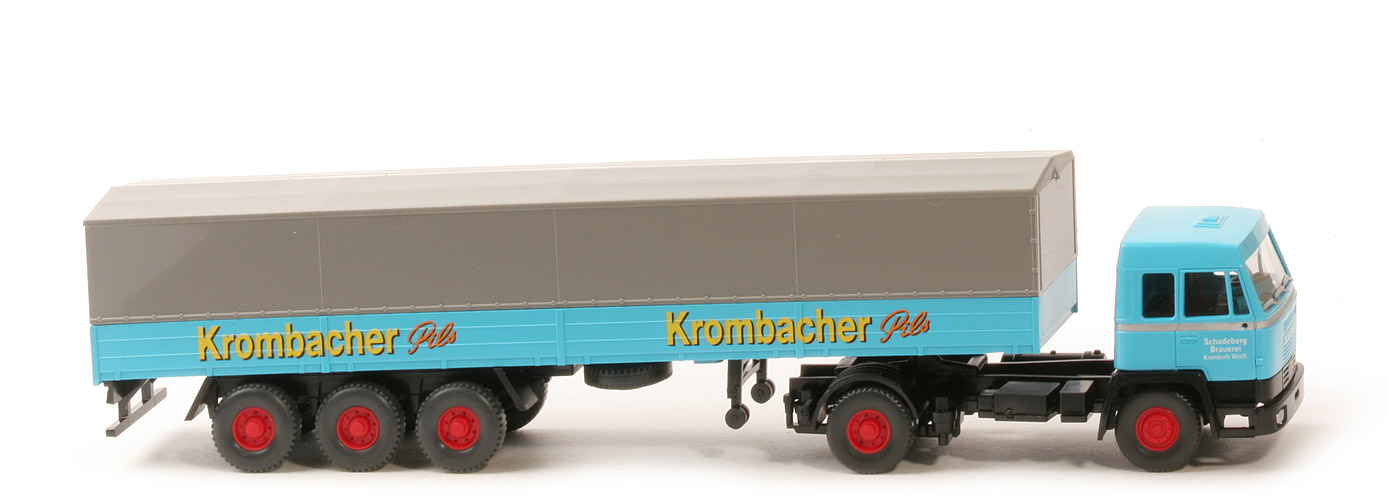 | Zugmaschine | Fahrerhaus oben | adriablau | Türdruck | "Schadeberg Brauerei, Krombach Westf." | Verglasung | klar | Inneneinrichtung | schwarz, Lenkrad separat | Fahrerhaus unten | schwarz | Chassis | schwarz | Kardanplatte | schwarz | Kotflügel hinten | schwarz | Sattelpfanne | schwarz, Roco | Räder | 12mm, Profil grob | Felgen | 8-Loch, rot | | Auflieger | Typ | Langpritsche Holz | Farbe Pritsche | adriablau | Pritsche Beschriftung | 2x "Krombacher Pils" | Pritsche Bodenprägung | Wiking | Pritscheneinlage | Pappe, silbern | Plane | platingrau | Chassis | schwarz | Chassis Bodenprägung | neues WIKING-Logo, Germany | Stützen | als Rollen, eingesetzt | Königzapfen | dünn (!), Roskopf-Relikt | 3-Achsaggegat Farbe | schwarz | 3-Achsaggegat Typ | Kotflügel eckig | Heck | gerade | Warndreiecke | neben Rückleuchten | Räder | 12mm, Profil grob | Felgen | 8-Loch, rot |
