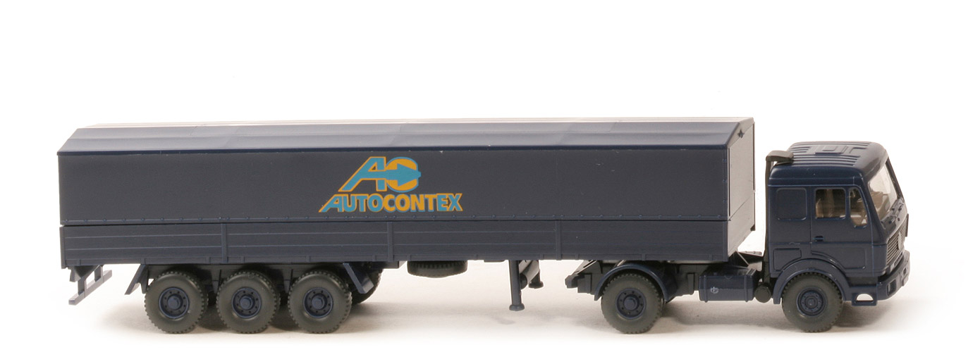 | Zugmaschine | Kabine Farbe | stahlblau | hintere Seitenfenster | geschlossen | Scheibenwischer | mit | Heckfenster | geschlossen | eingesetzter Grill | schwarz, mit MB-Stern, ohne Streifen | Inneneinrichtung | ca. graubeige, Lenkrad integriert | Ansaugstutzen | schwarz, hinter Kabinenrückwand | Stoßstange | stahlblau | Chassis | stahlblau, BP WIKING | Radlauf hinten | stahlblau | Reserverad | ohne | Beschriftung Kabine | ohne | Räder | 12 mm, Profil grob | Felgen | 8-Loch, stahlblau | | Auflieger | Art | 4-fach-Teilung | Farbe Pritsche | stahlblau | Beschriftung Pritsche | ohne | Pritsche Bodenprägung | Wiking, Berlin-W | Chassis | stahlblau | Pritscheneinlage | Pappe silbern | Plane | stahlblau | Beschriftung Seite | Logo, "Autocontex" (s. Foto) | Beschriftung Heck | Logo, "Autocontex", "Finnland, Norwegen, Schweden" | Dreiachsaggregat Farbe | schwarz | Dreiachsaggregat Typ | eingesteckt, Klipsachsen | Hydraulikstütze | stahlblau | Räder | 12 mm, Profil grob | Felgen | 8-Loch, stahlblau |