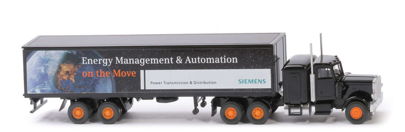 | Zugmaschine | Kabine | schwarz, mit Scheibenwischern | Dach | mit 5 Positionsleuchten | Haube/vordere Kotflügel | schwarz, kippbar, Blinker auf Kotflügel | Seitenaggregate | schwarz | Grill, Scheinwerfer, Stoßst. | silbern, mit Kennzeichen | Schlafkabine | schwarz | hier Dach | schwarz | Auspuffrohre, Tanks | silbern | Chassis, Motor, Kotflügel, ... | schwarz | Kardanplatte | schwarz | hier Bodenprägung | neues WIKING-Logo, Germany | Sattelpfanne | silbern, für großen Königsbolzen | Bedruckung Kabine | ohne | Reserverad | ohne | | Auflieger | Typ | Koffer, Chassis gesteckt | Farbe | schwarz | Türen | schwarz | Beschriftung Seiten | "Siemens, Energy Automation...", Sattelitenbild USA | Beschriftung Art | Druck | Chassis | schwarz, mit Unterfahrschutz | Chassis Bodenprägung | neues WIKING-Logo, Germany | DAA Typ | Klipsachsen, Kotflügel eckig | DAA Farbe | schwarz | Reserverad | unter Chassis gesteckt | Stütze | Rollen, schwarz | | Räder | Typ | 12 mm, 2-teilig, Felgen eingesetzt | Felgen | 8-Loch, orange | | Link | zum Vergleichsmodell Europa | |