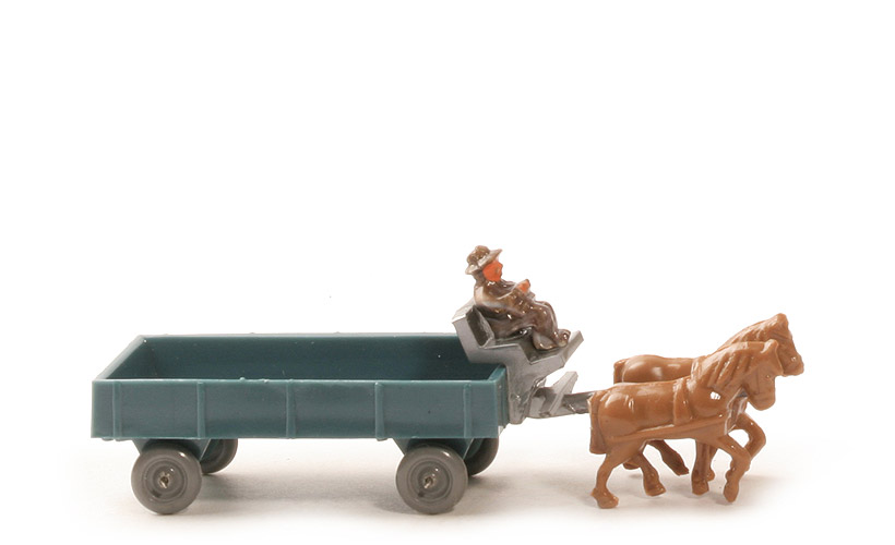 Räder | Drahtachser | Pritschentyp | ohne Querverbretterung | Farbe Pritsche | mattgraublau | Deichselrest | ohne | Pritschenboden | mit Struktur | Zughaken | integriert, nach unten | Deichsel/Kutschbock | silbern | Quersteg Deichsel | mit | Farbe linkes Pferd | ca. ockerbraun | Farbe rechtes Pferd | ca. ockerbraun | Kutscher Typ | Hut | Kutscher Farbe | ca. dunkles goldmetallic | Kutscher Bemalung | Gesicht, Hände | Räder | ca. platingrau |