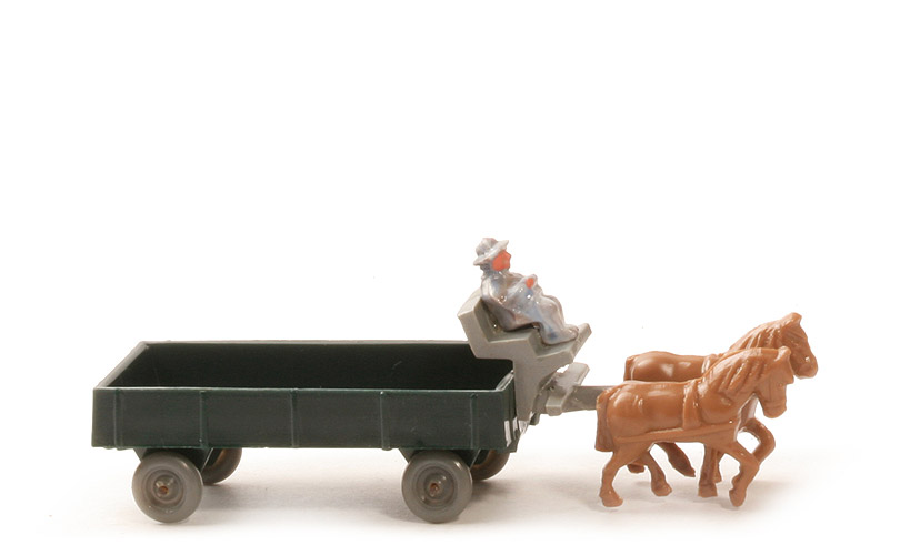 | Räder | Drahtachser | | Pritschentyp | ohne Querverbretterung | | Farbe Pritsche | schwarzgrün | | Deichselrest | mit | | Pritschenboden | mit Struktur | | Zughaken | integriert, nach unten | | Deichsel/Kutschbock | ca. lichtgrau | | Quersteg Deichsel | mit | | Farbe linkes Pferd | ockerbraun | | Farbe rechtes Pferd | ockerbraun | | Kutscher Typ | Hut | | Kutscher Farbe | ca. indigoblau misch | | Kutscher Bemalung | Gesicht, Hände | | Räder | glasiges staubgrau |