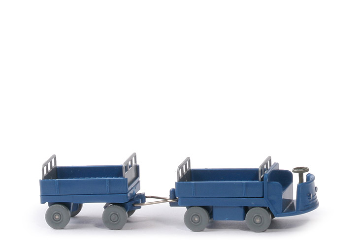 | Zugwagen | Grundfarbe | ca. capriblau | Fahrer | ohne | Lenkrad | ca. staubgrau, 3-speichig | Bodenprägung | neues WIKING-Logo, Germany, 1160 | Zughaken | integriert | Batteriekasten/Achshalterung | ca. capriblau | Aufsatz mit Gittern | mit | Bemalung Scheinwerfer | silbern | Räder | ca. 7 mm, ca. staubgrau | | Anhänger | Pritsche und Radlauf hinten | ca. capriblau | hier Bodenprägung | Germany | Drehschemel | über Bajonettverschluss am Aufbau | Chassis | ca. capriblau | Aufsatz mit Gittern | mit | Deichsel | Metall, kurz | Räder | ca. 7 mm, ca. staubgrau |