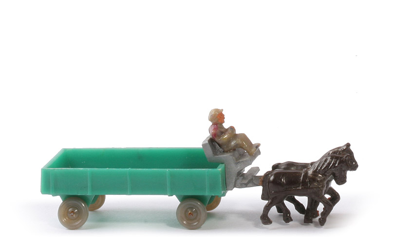 | Räder | Drahtachser | | Pritschentyp | ohne Querverbretterung | | Farbe Pritsche | grün | | Deichselrest | mit | | Pritschenboden | glatt | | Zughaken | ohne | | Deichsel/Kutschbock | silbern | | Quersteg Deichsel | mit | | Farbe linkes Pferd | schokobraun | | Farbe rechtes Pferd | schokobraun | | Kutscher Typ | Mütze | | Kutscher Farbe | mischfarben glasiges zementgrau | | Kutscher Bemalung | Gesicht, Hände | | Räder | transparent hellgrau |