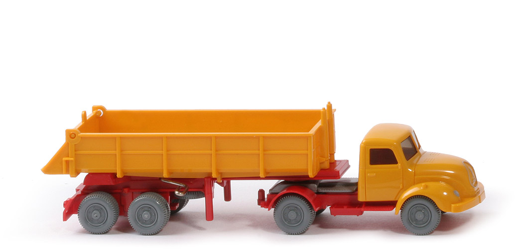 | Zugmaschine | Farbe Kabine | chromgelb | Version Kabine | Neuauflage ähnlich Typ 4a | Blinker | kurz und dick | Verglasung | stark getönt | Chassis Farbe | rot | Chassis Typ | Version 4 | Bemalung | Scheinwerfer, Magirus-Ei, Magirus-Logo silbern | Sattelpfanne | alt, mit Steg, für großen KöBo, ähnlich | Achshalterungen | offen | Bodenprägung | neues WIKING-Logo | Reserverad | ohne | Räder | 11 mm, 6-Loch, ca. staubgrau | | Auflieger | Farbe Mulde und Klappe | chromgelb | Farbe Chassis | rot | Bodenprägung Chassis | neues WIKING-Logo | Farbe Scharnierhalterung | rot | Farbe Achshalterung | rot | Bodenprägung Achshalterung | 67 s | Königsbolzen | stark | Reserverad | unter Chassis | Räder | 11 mm, 6-Loch, ca. staubgrau |