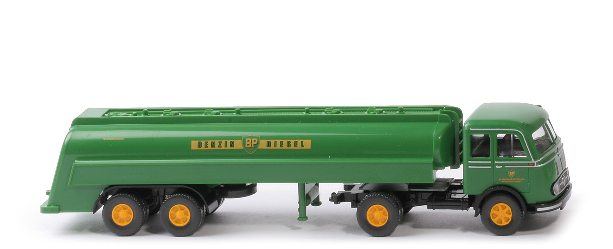 | Fahrerhaus | dunkles maigrün | | Bedruckung Fahrerhaus | Zierlinien, Türgriffe, Stern silbern, Blinker orange | | Bedruckung Türen | BP-Logo, "Benzin und Petroleum Aktiengesellschaft" | | Bedruckung Blinker | orange | | Grill | eingesetzt, schwarz | | Bedruckung Grill | Grillumrandung, Stern, Scheinwerfer, Zierlinie silbern | | Verglasung | klar | | Inneneinrichtung | ca. anthrazit | | Lenkrad | separat eingesetzt, ca. anthrazit | | Kotflügel vorne / Stoßstange | schwarz | | hier Bedruckung | Seitenzierleiste gesilbert | | Chassis, Kardaneinsatz | schwarz | | Bodenprägung | neues Wiking-Logo | | Kotflügel hinten | ohne | | Sattelpfanne | mit Steg für großen Königsbolzen ähnlich | | Zughaken | klein integriert | | Räder Typ | 12 mm, Felgen eingesetzt | | Felgen | Trilex, melonengelb | | | Auflieger | | Aufbau | dunkles maigrün | | Farbe Chassis, Armaturen | dunkles maigrün | | Stütze | dunkles maigrün | | Beschriftung Seite | BP - Benzin Diesel (s. Foto) | | Beschriftung Heck | BP, Feuergefährlich | | Beschriftung Art | Druck melonengelb | | DAA Farbe | schwarz | | Achseinheit Variante | Klipsachsen | | Bodenprägung Chassis | neues WIKING-Logo, Germany | | Reserverad | geklebt | | Räder Typ | 12 mm, Felgen eingesetzt | | Felgen | Trilex, melonengelb | | | Link | | zum Schwestermodell | MB LPS 332 Pullman |