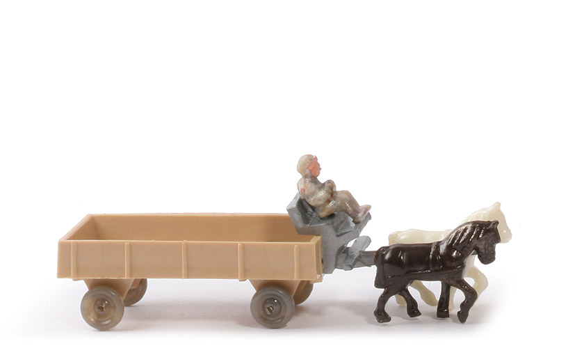 Räder | Drahtachser | Pritschentyp | ohne Querverbretterung | Farbe Pritsche | beige | Deichselrest | mit | Pritschenboden | glatt | Zughaken | ohne | Deichsel/Kutschbock | silbern | Quersteg Deichsel | mit | Farbe linkes Pferd | helles cremeweiß | Farbe rechtes Pferd | schokobraun | Kutscher Typ | Mütze | Kutscher Farbe | ca. graubeige meliert | Kutscher Bemalung | Gesicht, Hände | Räder | glasiges grau |