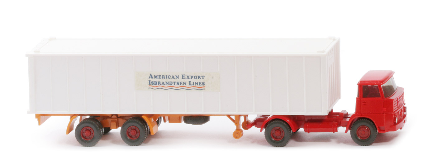 | | Zugmaschine | | Kabine oben | rot | | Kabine unten | rot | | Verglasung | getönt | | Chassistyp | neu | | Zughaken | ohne | | Fläche hinter Sattelpfanne | 3 Stege | | Chassisfarbe | rot | | Sattelpfanne | für großen Königsbolzen | | Reserverad | ohne | | Räder | 12mm, Profil fein | | Felgen | hellbraunrot | | | Container | | Art | 1 x 40 ft, gerippt | | Dach | weiß | | Korpus | weiß | | Türen | weiß | | Unterkante | breit | | Beschriftung | American Export ... (s. Foto) | | Beschriftung Größe | 5 Felder, Papieraufkleber | | | Auflieger | | Farbe | gelborange (Werbe) | | Unterfahrschutz | ohne | | Königsbolzen | stark | | Räder | 12 mm, Profil fein | | Felgen | hellbraunrot |