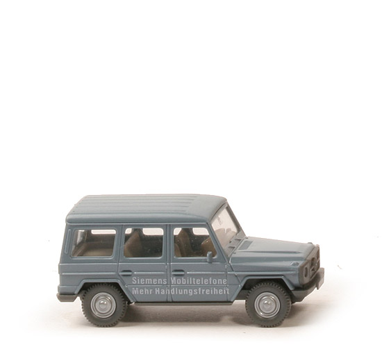 Farbe Karosserie | graublau | Hecktür | 2-teilig | Reserverad | ohne | Grill | Teil des Chassis | Verglasung | klar | Dach | separat aufgesetzt | Inneneinrichtung | ca. graubeige | Chassis Farbe | basaltgrau | Bodenprägung | WIKING - Berlin-W | Zughaken | ohne | Druck Fahrerseite | "Siemens Mobiltelefone", "Mehr Handlungsfreiheit" | Druck Beifahrerseite | "Siemens Mobiltelefone", "Mehr Handlungsfreiheit" | Räder | 9 mm | Radkappen | silbern |