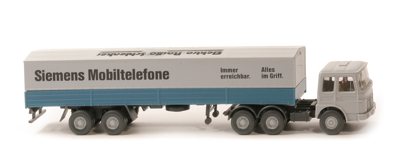 | Zugmaschine | Fahrerhaus | silbergrau | Verglasung | klar | Inneneinrichtung | mit Lenkrad | Spiegel | mit | Scheibenwischer | mit | Lüftergitter | ohne | Grill | silbern, mit Löwe | Motorblock | silbern | Chassis | dunkelbasaltgrau | Radlauf hinten | 2-teilig, dunkelbasaltgrau | | Auflieger | Art | 4-fach-Teilung | Farbe Pritsche | azurblau | Pritsche Bodenprägung | Wiking, Berlin-W | Chassis | dunkelbasaltgrau | Pritscheneinlage | Pappe, silbern | Plane | silbergrau | Druck | "Siemens - Mobiltelefone", ... (s. Foto), capriblau | Stützen | als Rollen, eingesetzt | Doppelachsaggegat Farbe | dunkelbasaltgrau | Doppelachsaggegat Typ | Version 4b, Kotflügel eckig | Heck | gerade | Warndreiecke | neben Rückleuchten | Räder | 12mm, Profil grob | Felgen | 8-Loch, silbergrau |