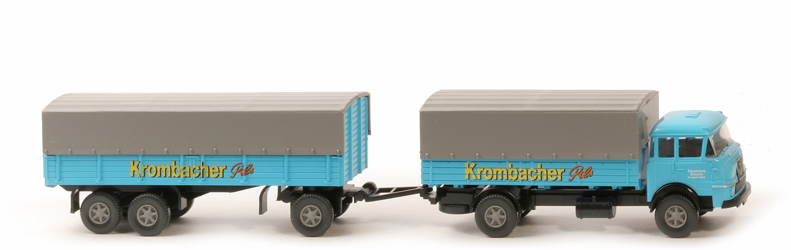 | Zugwagen | Kabine | adriablau | Grill | schwarz eingesetzt | Grill Bedruckung | Umrandung, "Krupp" und Emblem silbern | Bedruckung Front | Scheinwerfer, Zierlinie silbern | Verglasung | klar | Inneneinrichtung | schwarz, Lkr integriert | Stoßstange | schwarz | Chassis | schwarz, BP neues WIKING-Logo | Reserverad | hinten unter Chassis | Pritsche | adriablau | Plane | dunkels silbergrau | Räder | 12 mm, Profil grob | Felgen | dunkles silbergrau | Beschriftung | "Krombacher Pils" | | Anhänger | Farbe | adriablau | Rückleuchten | mit | Herstellerkennung Pritsche | neues WIKING-Logo | Chassis | schwarz | Herstellerkennung Chassis | neues WIKING-Logo | Achshalterungen | offen, schwarz | Achshalterungen Typ | trapezförmig | Drehschemel | eingesteckt | Deichsel | beweglich, angesteckt, Kunststoff | Plane | geschlossen, dunkles silbergrau | Reserverad | ohne | Räder | 12 mm, Profil grob | Felgen | dunkles silbergrau | Beschriftung | "Krombacher Pils" |