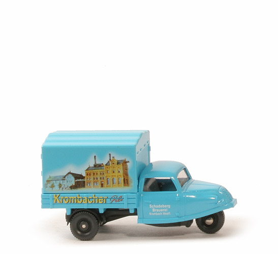 Farbe | adriablau | Bedruckung Türen | "Schadeberg Brauerei, Krombach, Westf." | Verglasung | klar | Scheibenwischer | mit | Inneneinrichtung | ca. platingrau, Lenkrad detailliert | Chassisfarbe | schwarz | Bodenprägung | WM | Bedruckung Scheinwerfer | ohne (leider) | Bedruckung Grill | ohne | Bedruckung Rückleuchten | ohne | Bedruckung Kennzeichen hinten | ohne | Bedruckung Pritsche | "Krombacher Pils" | Plane | adriablau | Bedruckung Plane | Bild der Produktionsstätte | Räder Typ | 7 mm | Räder Farbe | anthrazit |